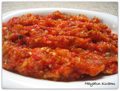 - Önce kırmızı biberleri közlüyoruz. Ben bunun için fırını kullanıyorum. Ama ızgaraya koymadan önce çekirdeklerini çıkarıyorum. Piştikten sonra çok zor ayıklanıyor. Fırının ızgarasını yakıp biberlerin her iki yüzünü közlüyorum. Kolay soyulması için sıcak sıcak bir torbaya koyup ağzını kapatıyorum. Soğuduğunda çok kolay soyuluyor.