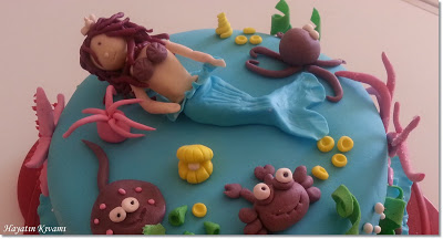 Modelleme konusunda biraz kendimi kötü hissettiğim için deniz kızını en sona bıraktım. Deniz kızını da yaptıktan sonra pastanın üzerini deniz mavisi şeker hamuru ile kapladım. Daha sonra da dizaynını yaptım.