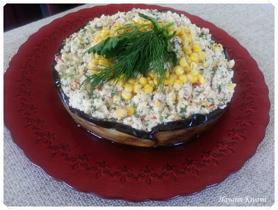 - Kelepçeli kalıbın kenarına kızarmış patlıcanları dizin. İçine bulgurlu karışımı doldurup üzerini düzeltin. Üstünü mısır ve yeşilliklerle süsleyin. Buzdolabında en az 1 saat bekletin. Sonra kalıptan çıkarıp servis edin.