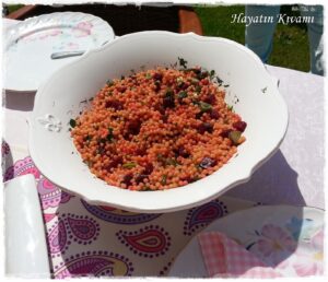 - Ertesi gün yoğurt ve su ile şişen bulgurun içine mayonez, yeşillikler, kırmızı biber, dövülmüş sarımsak, konserve mısır ve cevizleri koyup karıştırın.