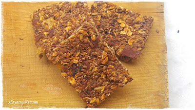 İçinde hiç şeker ve un olmayan bir tatlı. Hurma diğer bütün tahılları bir arada tutuyor. İçindeki tarçın kan şekerimizi düzene sokuyor. Bol lifli tahıllarla barsak düzenimiz normal hale geliyor. Chia sayesinde bol protein ve omega3 alıyoruz ve midemizde su alıp şişerek tokluk hissi yaratıyor. Hepsi bu kadar yararlı ve güzelken biraz da nefsimizi doyurmak için çikolatalı granül katalım dedim. Ama istemezseniz katılmayabilir. Yalandan biraz çikolatayı içinde gösterir gibi yapıyoruz. Tadı güzel, hurma sayesinde tatlı da. Zaten 12 ya da 16 parça çıkıyor. Bir tanesini bile yeseniz yetiyor. Benim gibi başkalarına ikram edin, yoksa tek başına tüketemezsiniz. Çevremizde bu sayede bir farkındalık oluşturalım.