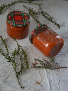 - Hepsi birlikte kaynayıp yarı yarıya azaldığında içine tereyağı, aroma verici taze baharatları , hatta bir de sarımsağı koyup aromasını verdikten sonra kavanozlara koyup kapağını tutmasını sağlamak kalıyor geriye.