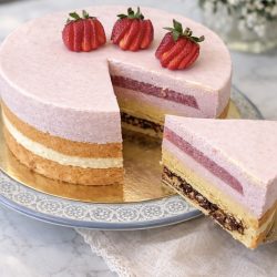 - Son katın üzeri yine çilekli bir mousse ile kaplanacak. Bunun için de mousse yapılıp pandispanyanın üzerini 1 cm kadar kapladıktan sonra biraz buzdolabında dinlendirmek, sonra jöleyi ortasına koyup geri kalan alanları yine mousse ile kaplamak gerekecek. Pastanın kalıptan kolay çıkması için de kalıbın içine kalın bir asetat kullanırsanız işiniz çok kolaylaşıyor.
