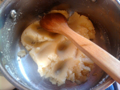- Karıştırarak malzemeyi eritiyoruz. Hepsi eriyince 4 yemek kaşığı tepeleme unu ilave ediyoruz. Un mutlaka tepeleme olacak !