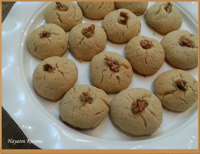 • Hamurdan ceviz büyüklüğünde parçalar kopararak yuvarlayın ve yağlanmış tepsiye dizin. Dilerseniz kurabiyelerin ortasına ceviz ya da fındık koyun ve önceden ısıtılmış 170 derece fırında 20 dakika kadar pişirin.