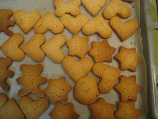 - Bekletilen hamur 0,7 cm kalınlığında açılarak şekil kalıplarıyla kesilir. Yağlı kağıt serilmiş tepsiye konularak önceden ısıtılmış 170 derece fırında 20 dakika kadar pişirilir.