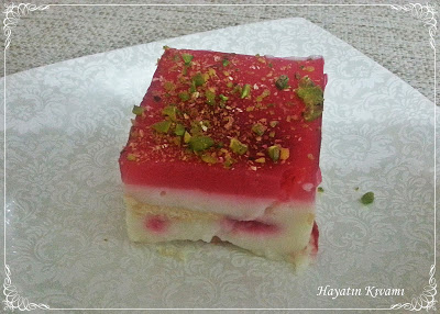 Baktım ki resim güzel olmamış, bu sene de vişnelerimiz çok odu, hemen gerçek vişneden yapıp sizin için olması gereken renkte tatlıyı yaptım, afiyet olsun.