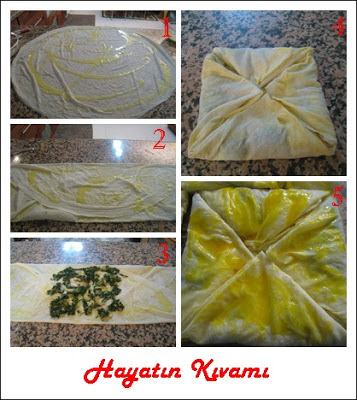 - Yufkanın bir tanesi tezgaha yayılır. Hazırlanan içle yağlanır, alt ve üst uçları kapatılır, içi yağlanır, ortasına ıspanaklı içten konur, sağ ve sol yanı kapatılır. Yeniden yağlanıp köşeleri kapatılır ve tepsiye alınıp, kesilir.
