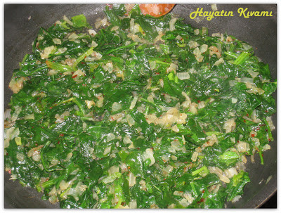- Soğan yemeklik doğranır ve sıvı yağda öldürülür. İçine güzelce yıkanıp ince doğranmış ıspanaklar konularak kavrulur. Ispanakların rengi dönünce baharatlar eklenip soğumaya bırakılır.