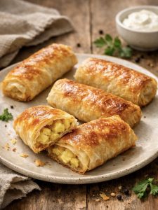 - Yufkanın bir tanesi tezgaha yayılır. Hazırlanan içle yağlanır, alt ve üst uçları kapatılır, içi yağlanır, ortasına ıspanaklı içten konur, sağ ve sol yanı kapatılır. Yeniden yağlanıp köşeleri kapatılır ve tepsiye alınıp, kesilir.