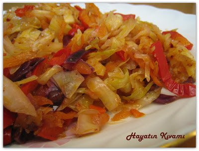 - Lahana ince jülyen doğranır, biraz tuzla ovularak soğanlı kırmızı biberlerin üzerine eklenir. 5-10 dakika kavrulur. Ben mor lahana da ekledim, çok renkli oldu.