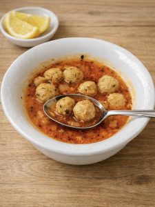 - Çorbayı yapmaya köftelerden başlıyoruz. Kıyma, ezilmiş sarımsak pul biber, karabiber, kimyon ve ufalanmış tercihen kepek ekmeği ile ya da galeta unu ile yoğuruyoruz. Küçük köfteler halinde yuvarlıyoruz.