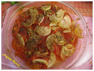 - Tepsiye yerleştirilen domateslerin üzerine piyaz gibi doğranmış soğan ve ezilmiş sarımsaklar konur. Kekik, taze çekilmiş karabiber ve toz şeker serpilir. Zeytinyağı gezdirilir.