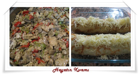 - Her bir krepin içine tavuklu mantarlı içten koyulup büyükçe bir sigara böreği gibi sarılır. Yağlanmış tepsiye yerleştirilip üzerine rendelenmiş kaşar konur fırında kaşarlar eriyinceye kadar 5-10 dakika pişirilir.