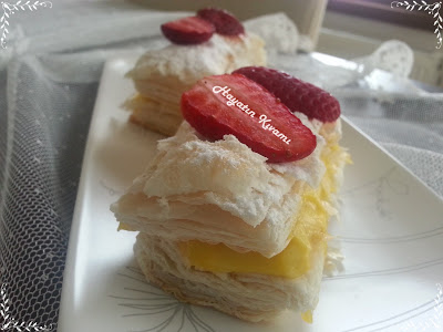 - Milföyler pişip ılınınca aralarına hazırladığınız kremadan sürüp iki tanesini üst üste koyun. Üstteki milföylerin üzerine pudra şekeri serpip buzdolabına kaldırın. 4-5 saat sonra servis edebileceksiniz. Servis ederken üzerini meyve dilimleriyle süsleyebilirsiniz.