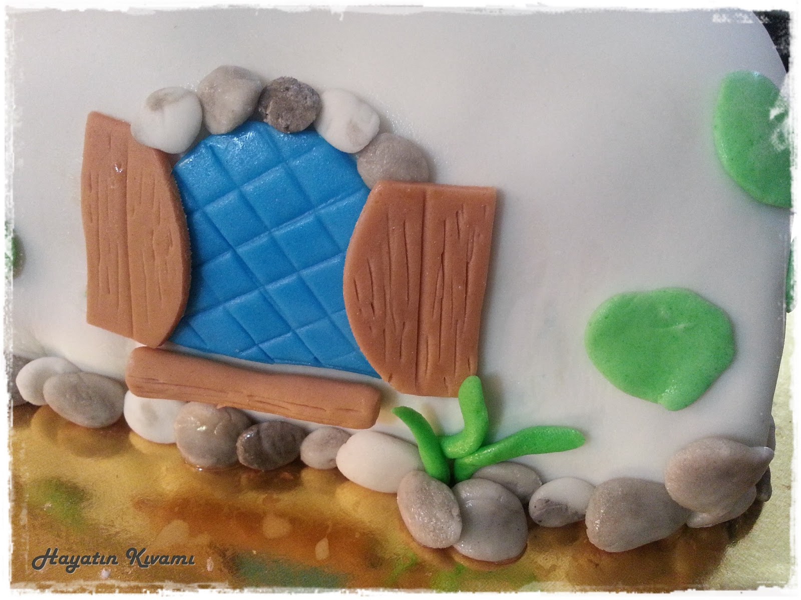 Duvarına yeşilden taş parçaları yapıştırdım. Kepenklerin arasına maviden camını yapıp üzerine taşlar koydum. Kenardaki bazı taşların arasından otlar çıkardım.