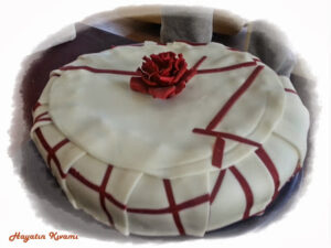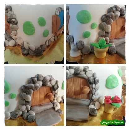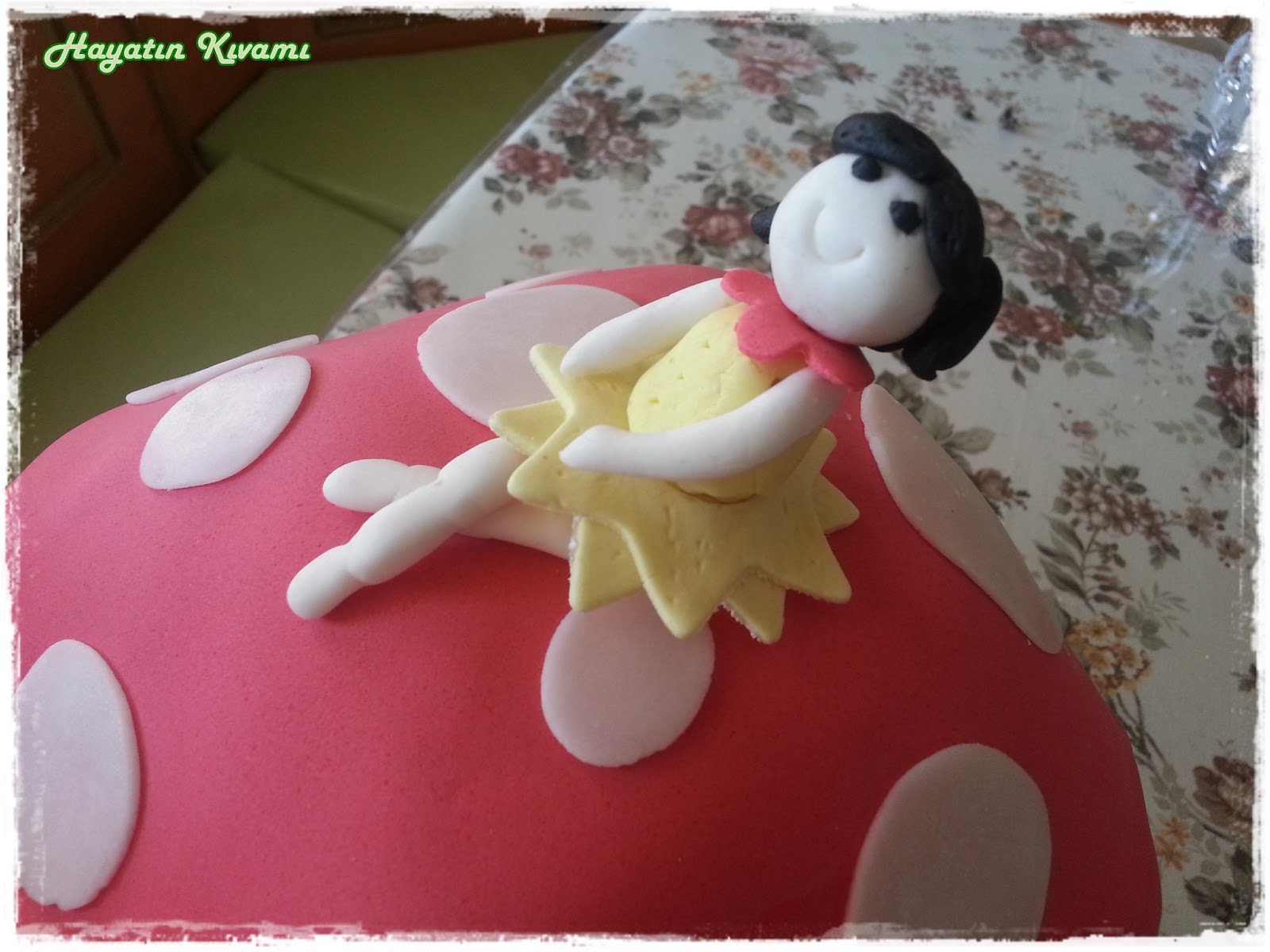 Üzerine oturtmak için siyah saçlı, saçlarını iki kulak şeklinde bağlamış bir kız yaptım. Oldukça yüksek bir pasta olduğu için iki parça halinde buzdolabında beklettim ve servis zamanı parçaları biraraya getirip kızı en üstüne oturttum.