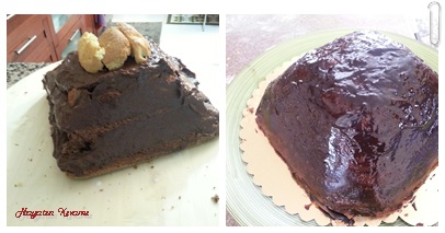 Aralarına kakaolu yağlı pasta kreması sürdüm. Üstteki parçaların üzerini düzeltmek için de aynı kremadan biraz kullandım. Bunun üzerini de ganaj ile kapladım.