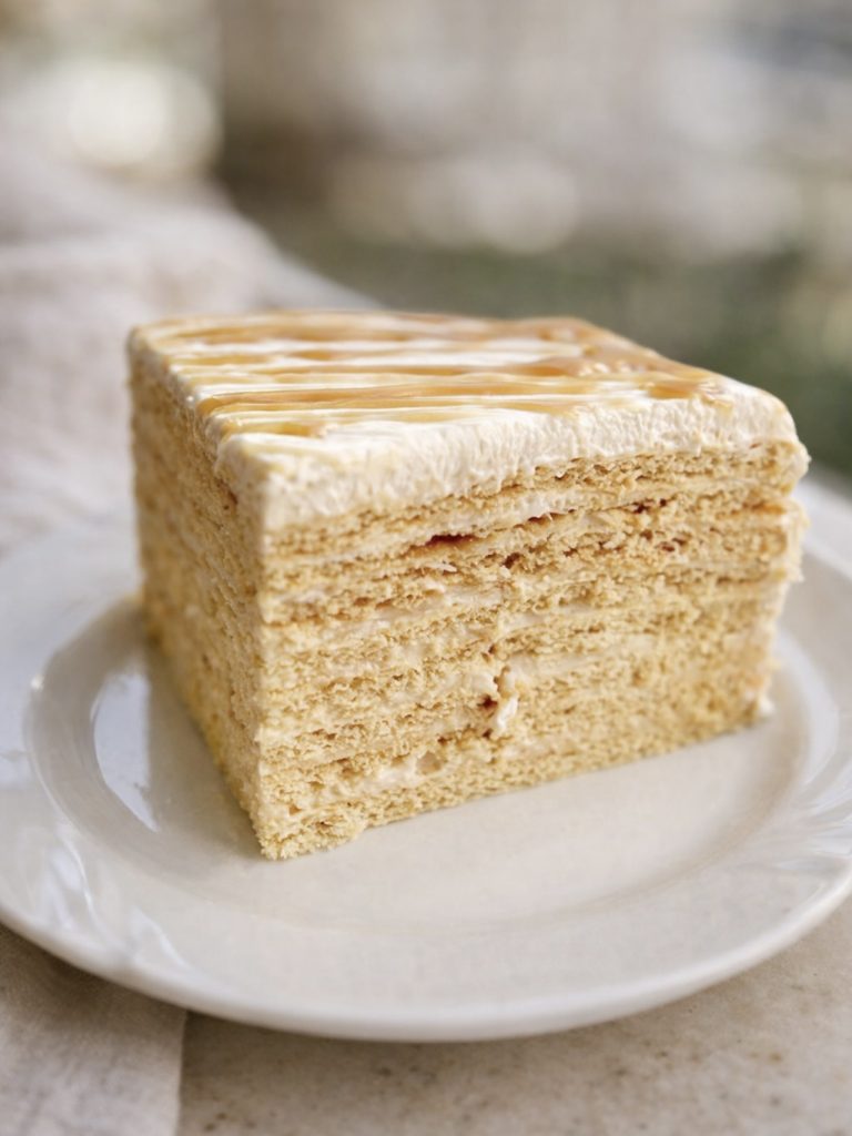 • Krema piştikten sonra 2-3 dakika bekleyin. Sonra bütün katmanların arasına çok fazla olmayacak şekilde sürerek üst üste birleştirin. Kalan krema ile kenardaki boşlukları da kapatın.