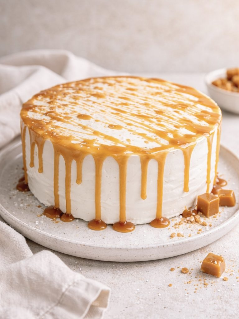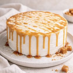 • Üzerini ve yanları kaplama kreması ile kaplayın. Dilerseniz karamel sos ile üzer,ine süsleme yapın.