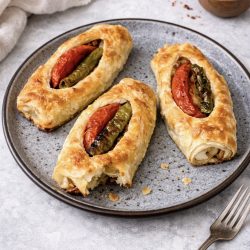 - Yumurta sarıları sürülmüş böreklerin karınları yarın ve içine birer dilim domates ve biber koyun. Önceden ısıtılmış 180 derece fırında üzeri kızarana kadar pişirin.