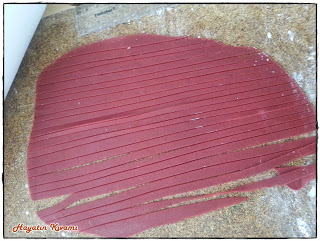 Oluşan çizgili hamurdan dikdörtgen parçalar kesip çıkardım. hamurun yanlarına bunları birer cm’leri üst üste gelecek şekilde yerleştirdim.