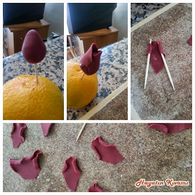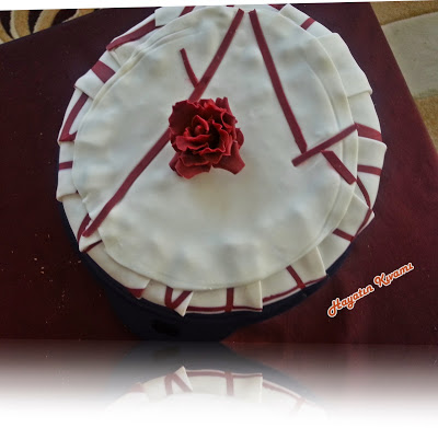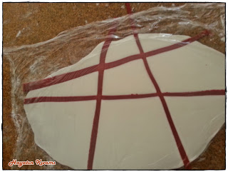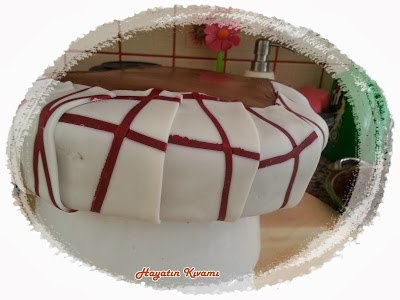 Bu sefer üzerini tamamen düz bir şekilde şeker hamuru ile kaplamak yerine dikdörtgen parçalar halinde kapladım. Düz bir hamur da kullanmadım. Siyah ve kırmızıyı karıştırarak elde ettiğim bordodan ince şeritler kestim ve beyaz hamurun üzerine bunları gelişi güzel çizgiler halinde koyup bir kez daha merdane ile üzerinden geçtim.