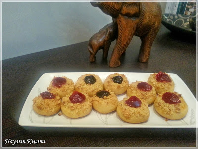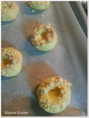 - 170 derece ısıtılmış fırında 20 dakika kadar hafif pembeleşinceye kadar pişirilir. Soğuduktan sonra ortadaki çukurlarına marmelat konur ve servis edilir.