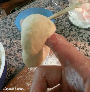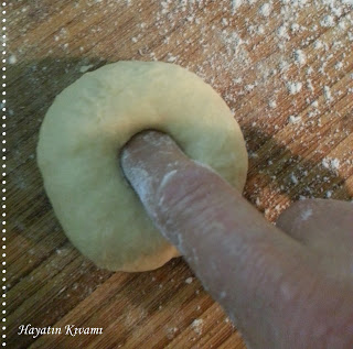 - Yarım saat dinlenmiş hamurdan yumurta büyüklüğünde parçalar koparılır. Elde yuvarlanır ve hafifçe bastırılır. İşaret parmağı ile bir delik açılır, bu delikten takılan parmak etrafında hamur döndürülerek delik büyültülür.