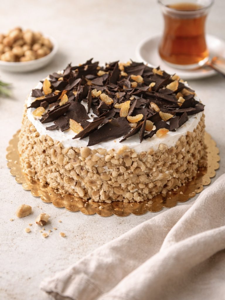 - Soğuyan pasta altındaki karton sayesinde bir elde tutulur. Diğer avuç içine fındık alınarak kenarlarına yapıştırılır. Çevirerek her tarafı kaplanır.