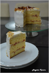 - Hamuru 4 kerede pişireceksiniz. Altına pişirme kağıdı serilmiş kelepçeli bir kalıba hamurun 1/4’ünü koyup üzerini düzeltin. Toz şekeri ve hindistan cevizi serpin.