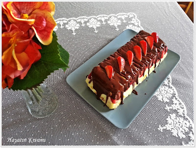 • Çikolata sosu üzerindeki tarife göre hazırlanır. Bunun yerine hazır çikolata sosları da kullanılabilir. Pastanın üzeri çikolata sosu ile süslendikten sonra çilekler de yerleştirilir. Bir saat kadar daha buzdolabında bekletildikten sonra servis edilebilir.