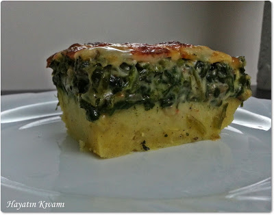 - Yaptığımız beşamel sos suyunu iyice çeken ıspanak karışımına konur, karıştırılıp pürenin üzerine yayılır.