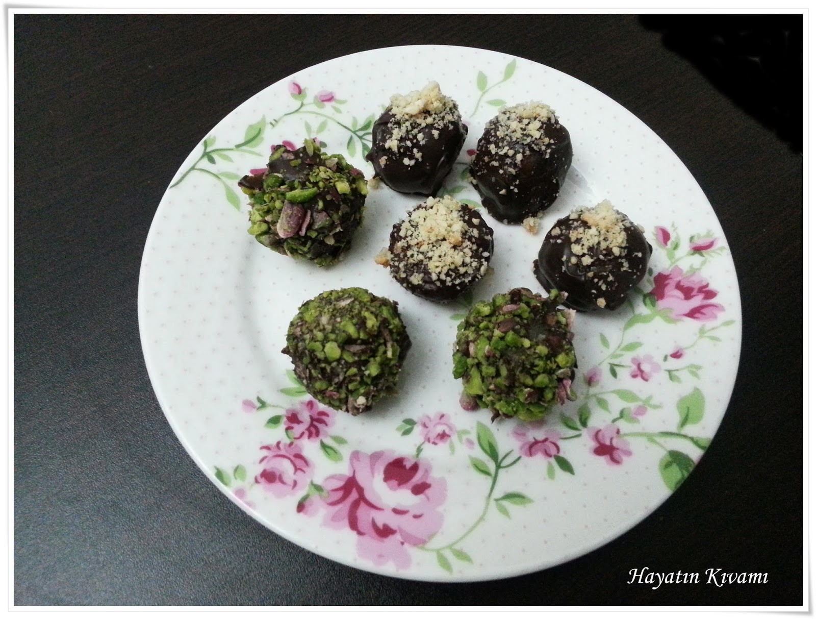 - Ilınınca yuvarlak şekil verilir. Önce erimiş çikolataya sonra fındığa veya fıstığa bulanır. Çikolatanın donması için pişirme kağıdı serili tabağa alınır. Şekli tamamen donunca servise hazırdır.