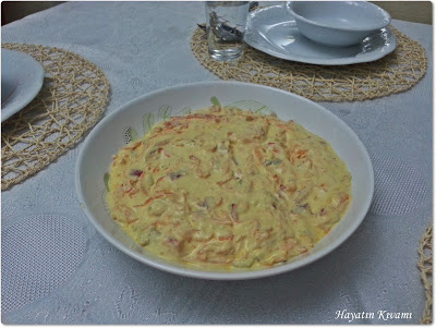 - Havuç, kırmızı biber ve patlıcan karıştırma kabına alınır, tuz ekildikten sonra yoğurtlu karışım da koyularak karıştırılır. Sonra servis tabağına alınır.