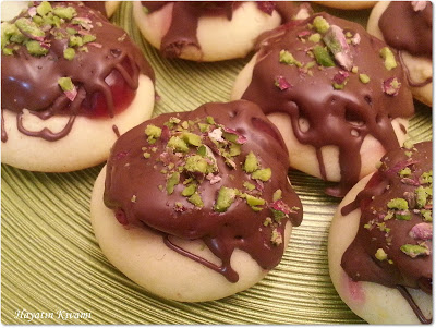• Çikolatayı ben mari eritin, kurabiyelerin üzerini gelişigüzel süsleyin. Üzerine antep fıstığı ile süsleyin ve buzdolabında çikolatası ve sosu sertleşinceye kadar bekletin. Sonra hemen servis yapabilirsiniz.