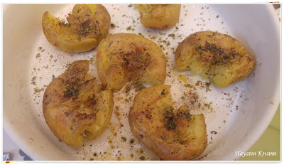 • Haşlanmış patatesleri fırın tepsisine alıp üzerine elinizin ayası ile bastırıp çatlatın.
