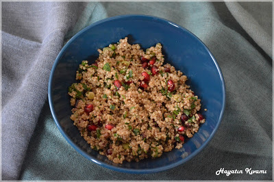Bu haftaki misafirlerim biraz da sağlıklı gıdalarla beslenmek istedikleri için salatada trend bir yiyecek kullanayım dedim ve kinoayı seçtim. Kinoa protein açısından oldukça zengin bir bir besin, pek çok şeye de faydası var. Gluten içermeyen bir besin ve lifli yapısı sayesinde de tok tutmaya yardımcı, bu yüzden de diyet listelerinde adı geçiyor. Kinoa sindirimi kolay bir besin ve yağ yıkımı da arttırdığı için tam da aradığımız yiyecek. Bugün için yalnızca salatasını yaptık ama ilerde başka tariflerde de kullanacağımıza eminim.