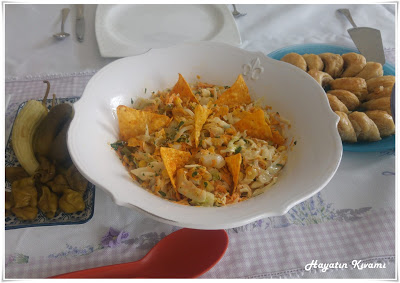 Bu salatayı yerken hep aynı yanılgı oluyor. Daha önce bize ikram edildiğinde de içinde tavuk olduğuna inanmıştık, bugün misafirlerime yaptığımda onlar da aynı şeyi hissedip tavuklu bir salata yediklerini söylediler. Sanırım içindeki kaşar ve cips bir araya gelince böyle hissettiriyor.