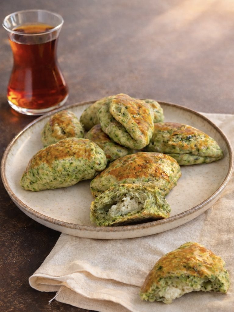 İnternette hep yeşil poğaçaları görürdüm ve bunlarda renk verici olarak da ıspanağın kullanıldığını biliyordum. Ama bence ıspanak kek ya da poğaçalarda piştikten sonra renk verme dışında tadına pek fazla bir katkı sağlamıyor. Öyle olmasa hem tatlı hem de tuzlu olarak kullanamazdı sanırım. Devamlı araştırma yapmak ya da her seferinde farklı şeflerin tariflerini gözlemlemek sanırım bu işe çok yarıyor. Çünkü Hazer şefin yeşil lazanya yapmasını gördüğümde hemen bunu böyle bir tarife uygulamayı düşündüm. İçine katılan yeşillikler çok daha fazla aromatik lezzetlerdi, o yüzden bu yeşil sıvıyı hemen poğaça tarifine dönüştürdüm. İşte o tarif…