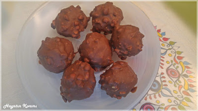 - 1 saat kadar buzdolabında bekledikten sonra çikolataları ben mari usulü eritip içine ince çekilmiş kalan fındıkları da karıştırdıktan sonra topları buna bulayın ve yine pişirme kağıdı üzerine yerleştirip buzdolabına kaldırın. 1 saat sonra servise hazır olacaktır.