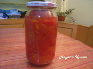 - 10-15 dakika sonra tülbenti çıkarıp sosu sıcakken kavanozlara koyup ağzını sıkıca kapatın, ters çevirip kapağın tutmasını sağlayın. Ya da kapağı kapattıktan sonra tencereye alıp üzerini geçecek kadar su koyup en az yarım saat kaynatın. Amacımız kapağın tutmasını sağlamak.