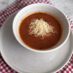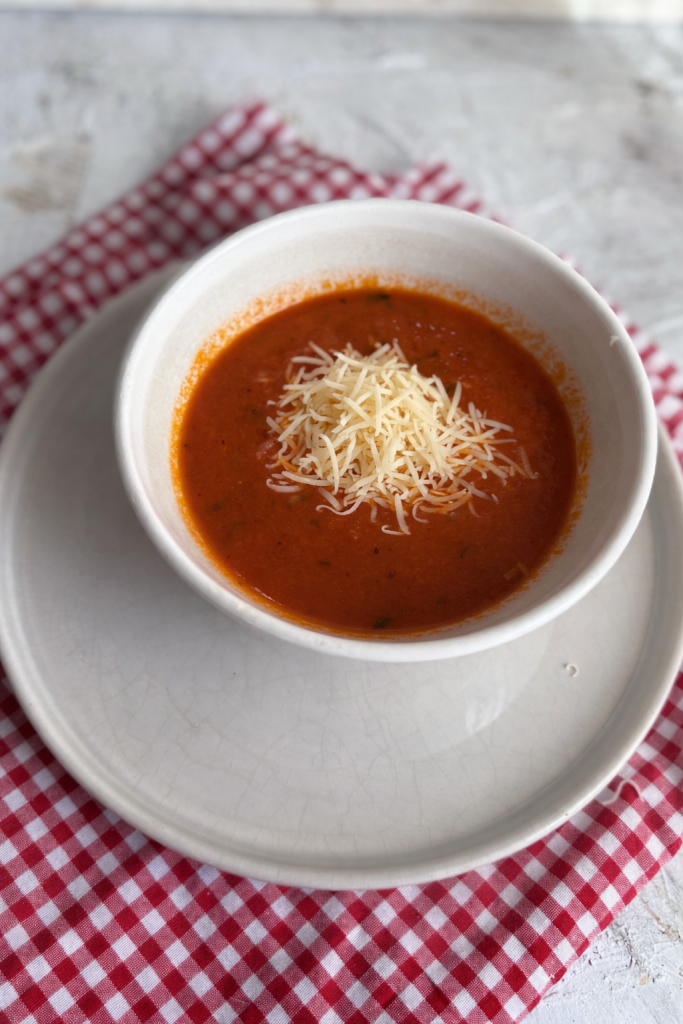Fırında aromalandırılmış domateslerle hazırlanan, yoğun lezzetli ve pürüzsüz bir domates çorbası.