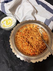 - Domatesler pişince kuskus ilave edilir. Birlikte birkaç kez karıştırılır.