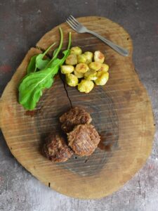Eti için kırmızı ve yeşil biberi ince doğrayıp sıvı yağda soteliyoruz, biraz sonra içine 1 büyük kuru soğanı ekliyoruz. Hepsi pişince içine haşlanmış kuşbaşı etleri ekliyoruz. Biraz daha kavrulunca 1-2 yemek kaşığı salça, ardından da baharat olarak tuz, karabiber, kimyon ve kekik koyup ocağın altını kapatıyoruz.