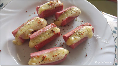 Hafta sonu geliyor, kahvaltıya kolay ve değişik bir alternatifim var. Buyrun sofraya… MALZEMELER:SosisKaşar peyniriKekikPul biber2 diş sarımsak1 yemek kaşığı salçaYAPALIM: Sosisleri soyulmuş sarımsak ve salça …